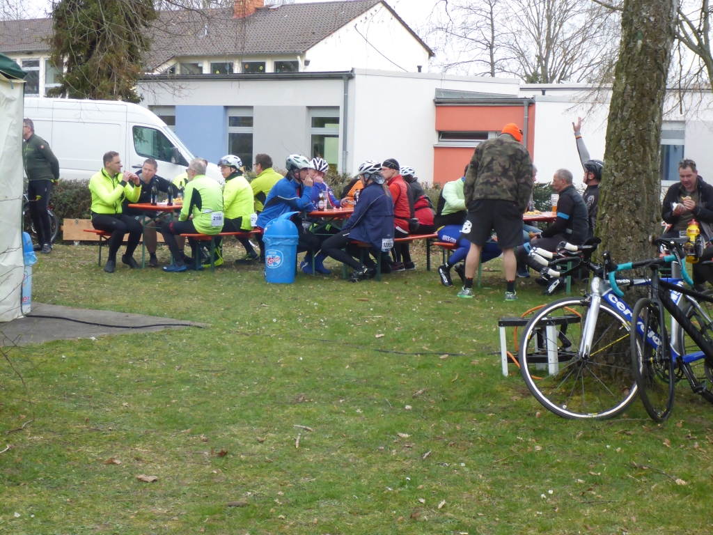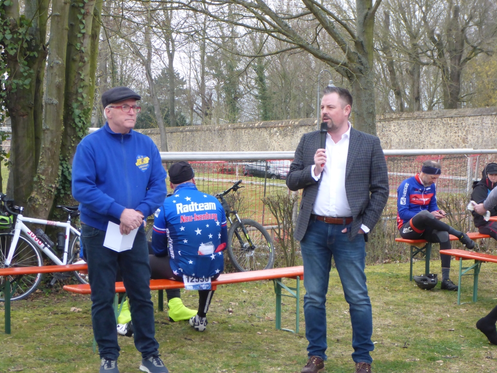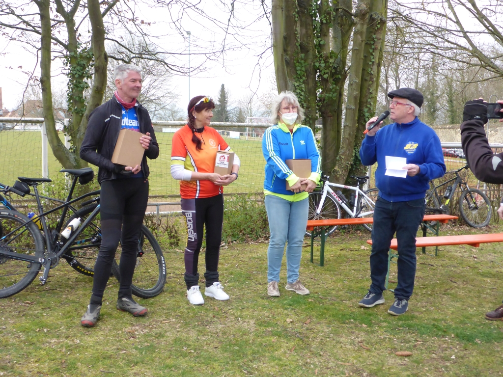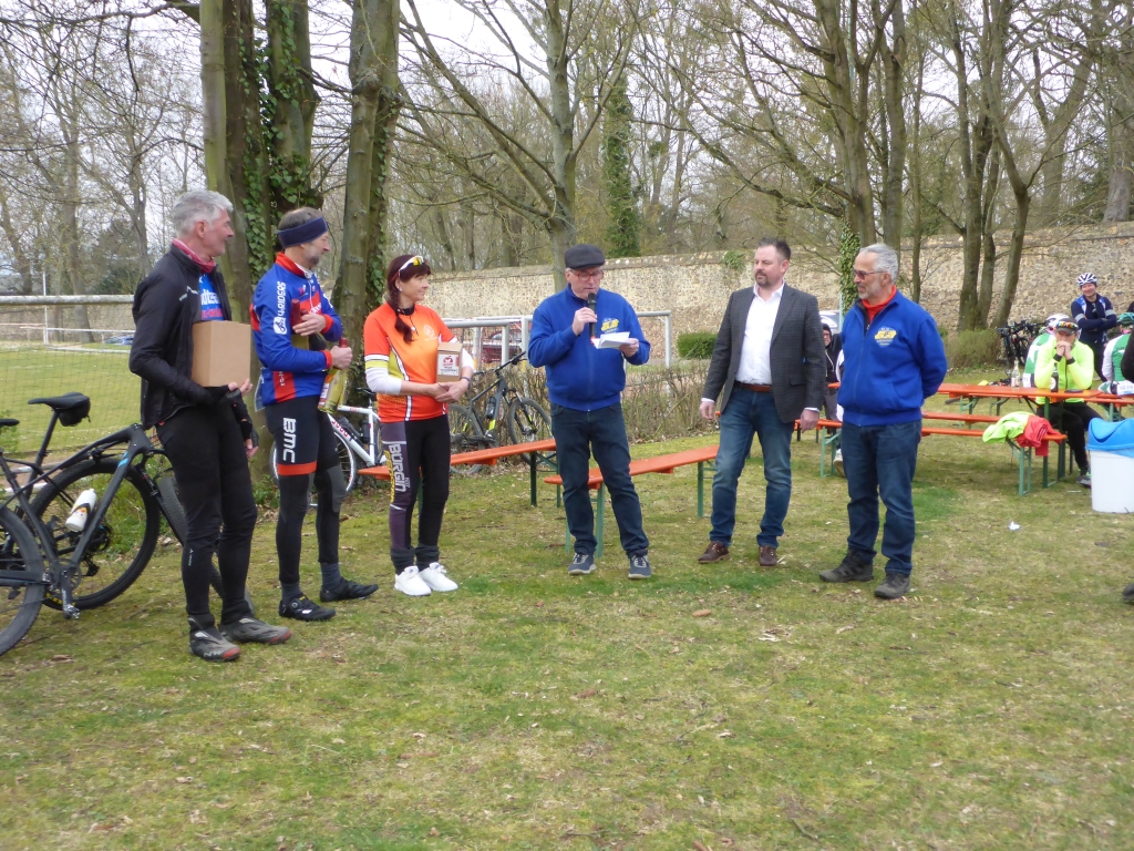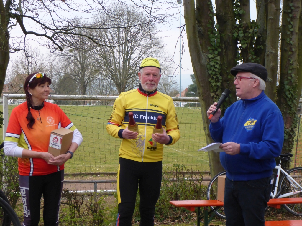 Im Ziel, die Pedale sind in Ruhestellung, die erbrachte Leistung wurde in die Wertungskarte und/oder Startkarte bescheinigt, richtete Herr Klein, Vertreter des Niddataler Bürgermeisters Michael Hahn ein Grußwort an die Radlerinnen und Radler. Im Anschluss wurden durch den RTF-/CTF-Fachwart Johannes Contag mit Wilhelm Schröder die Siegerehrungen vorgenommen. Geehrt wurden in der Gruppe der RTF-Vereine auf dem ersten Platz der RC Hattersheim mit 28 Teilnehmern. Es folgten das Radteam Neu-Isenburg /19 Teilnehmer) und der RV Ober-Mörlen (12 Teilnehmer). In der Gruppe der CTF-Teilnehmer wurden der RTC Sandhasen Wölfersheim und der VC Frankfurt geehrt, beide mit Teilnehmerzahlen im einstelligen Bereich. Statt der üblichen Hardware sind regionale Flüssigkeiten zur Ehrung übergeben worden, die es auf Wunsch mit und ohne Suchtpotential gab.