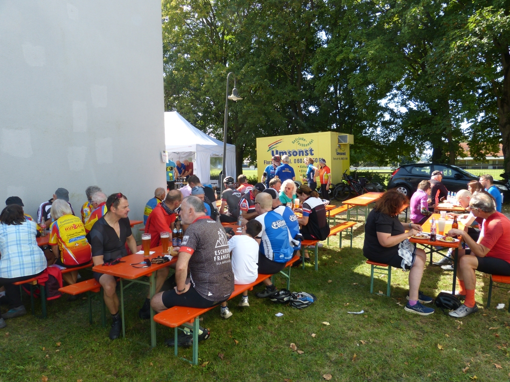 Nach der Tour saß man wieder zusammen. Der Gesprächsstoff ging rund um das Radfahren und darüber hinaus nicht aus. Getränke, Kaffee, Kuchen, Leckeres vom Grill, Pommes und gar Kartoffelpuffer mit Apfelmus sorgten dafür, die leergefahrenen Speicher wieder zu füllen.