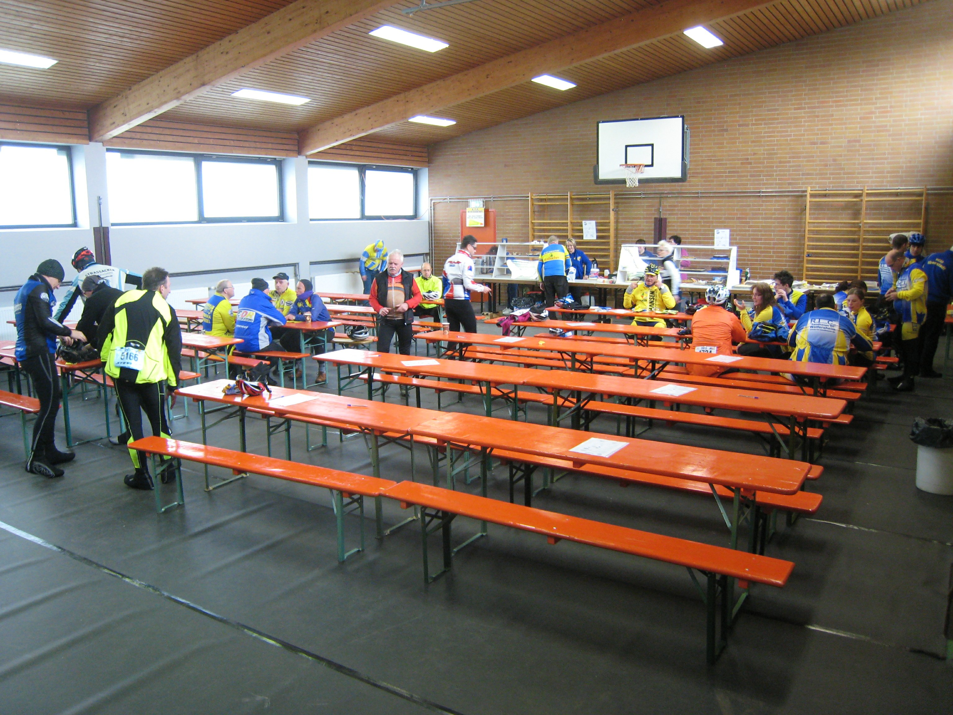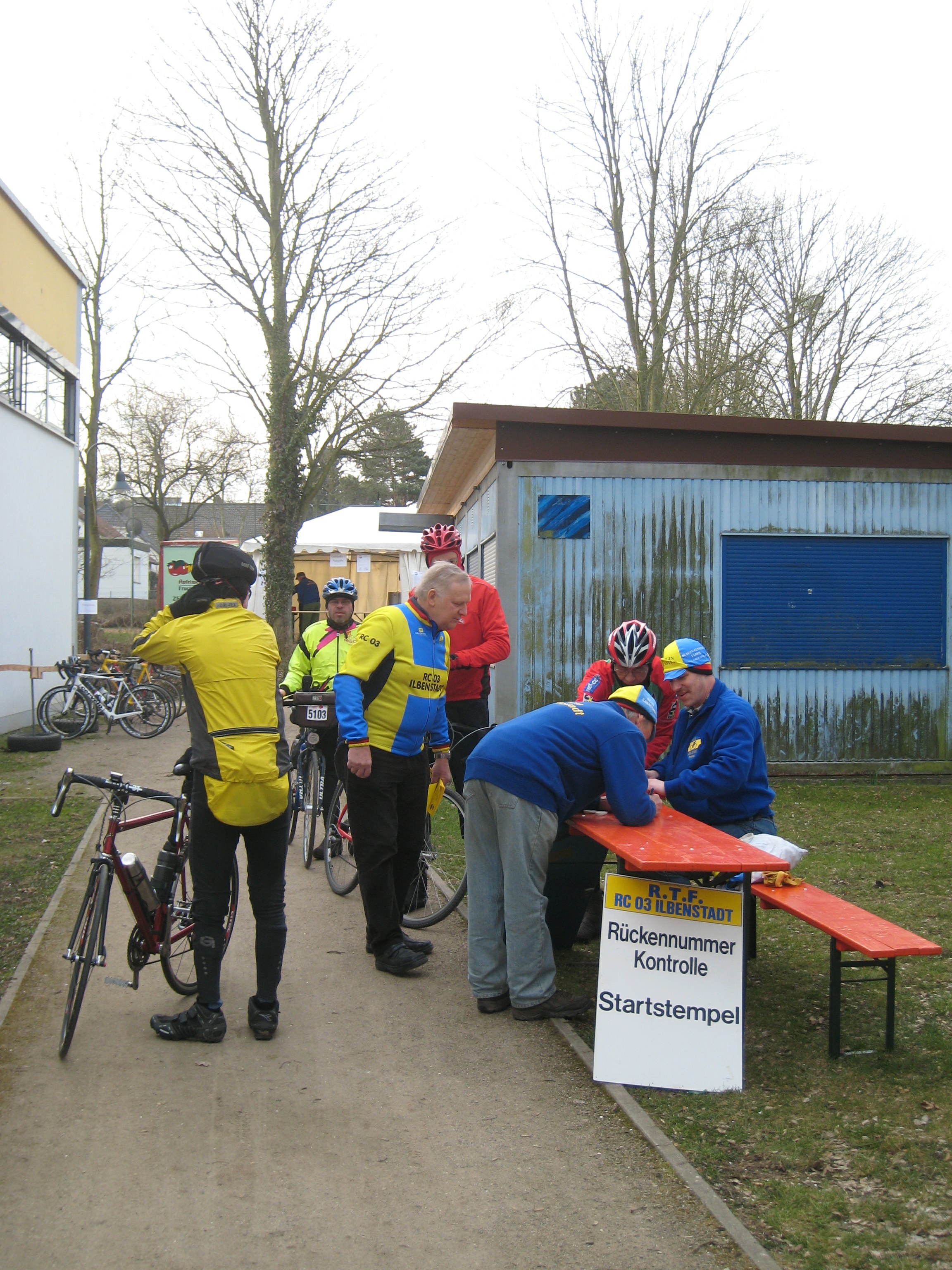 Im Vorfeld unserer diesjährigen Frühjahrs-RTF, der Wetterau-Vogelsberg-Rundfahrt, spielten die Wettervorhersagen mit den Nerven der Verantwortlichen. Bedeutet doch die Organisation und Durchführung einer solchen Veranstaltung einen hohen logistischen Aufwand und ist nicht zuletzt auch mit finanziellen Risiken behaftet. Der „Wetterfrosch“ Lars-Henning Metz hatte im ersten Programm des Hessischen Rundfunks im Laufe der Woche resigniert, von bitterer Kälte gesprochen und wollte am Sonntag dem Langlaufen im Vogelsberg den Vorzug geben. Immerhin hatte er eine weitgehende Niederschlagsfreiheit angekündigt. Am Freitag schwenkte dann ein Wetterdienst im Internet auf durchgehenden Schneefall am Sonntag über, gab aber diese bereits am nächsten Tag wieder auf. Wir verbreiteten nach innen und außen Optimismus und ließen die Vorbereitungen auf normalem Niveau laufen. Für die Kontrollstellen wurden Bananen, Gebäck und Tee eingekauft und verteilt; am Start und Ziel die Erbensuppe, Grillwürste und die Kuchentheke vorbereitet. Am Sonntag wurden bei minus 4° Celsius die restlichen Aufbauarbeiten pünktlich vor Startbeginn beendet und um 07:30 Uhr war der erste Starter Erich B. an der Startkartenausgabe. Doch musste er sich bis 08:00 Uhr, der festgesetzten Startzeit gedulden, bevor er die 114 Kilometer-Strecke unter die Räder nehmen konnte. Jetzt kamen langsam immer mehr Radsportlerinnen und Radsportler an den Start und bis 10:30 Uhr waren rund 250 auf den Strecken. Alle waren warm eingepackt und haben die Tour unbeschadet überstanden, wenn auch hier und da kalte Finger und Fußzehen beklagt wurden. Unser Respekt gilt allen, die sich des Morgens bei Minusgraden für die Tour entschlossen haben. Eine kleine Gruppe englischsprachiger Gäste hat auf ihrem Blog „Tour de Force“ anschaulich und sicherlich stellvertretend für viele beschrieben, was es hieß, sich an diesem Tag auf das Rad zu setzen, wenn ein sibirischer Wind in der Geschwindigkeit eines französischen Hochgeschwindigkeitszuges entgegenkommt und Gedanken an eine Lungenentzündung aufkommen lässt. Doch auch diese Radlergruppe hat die Tour überstanden und war gut gelaunt am Ziel angekommen. Im Zielbereich konnte man sich schnell aufwärmen und die Erlebnisse in geselliger Runde austauschen, bieten doch anstrengende Touren und extremes Wetter Gesprächsstoff auch über den Tag hinaus.