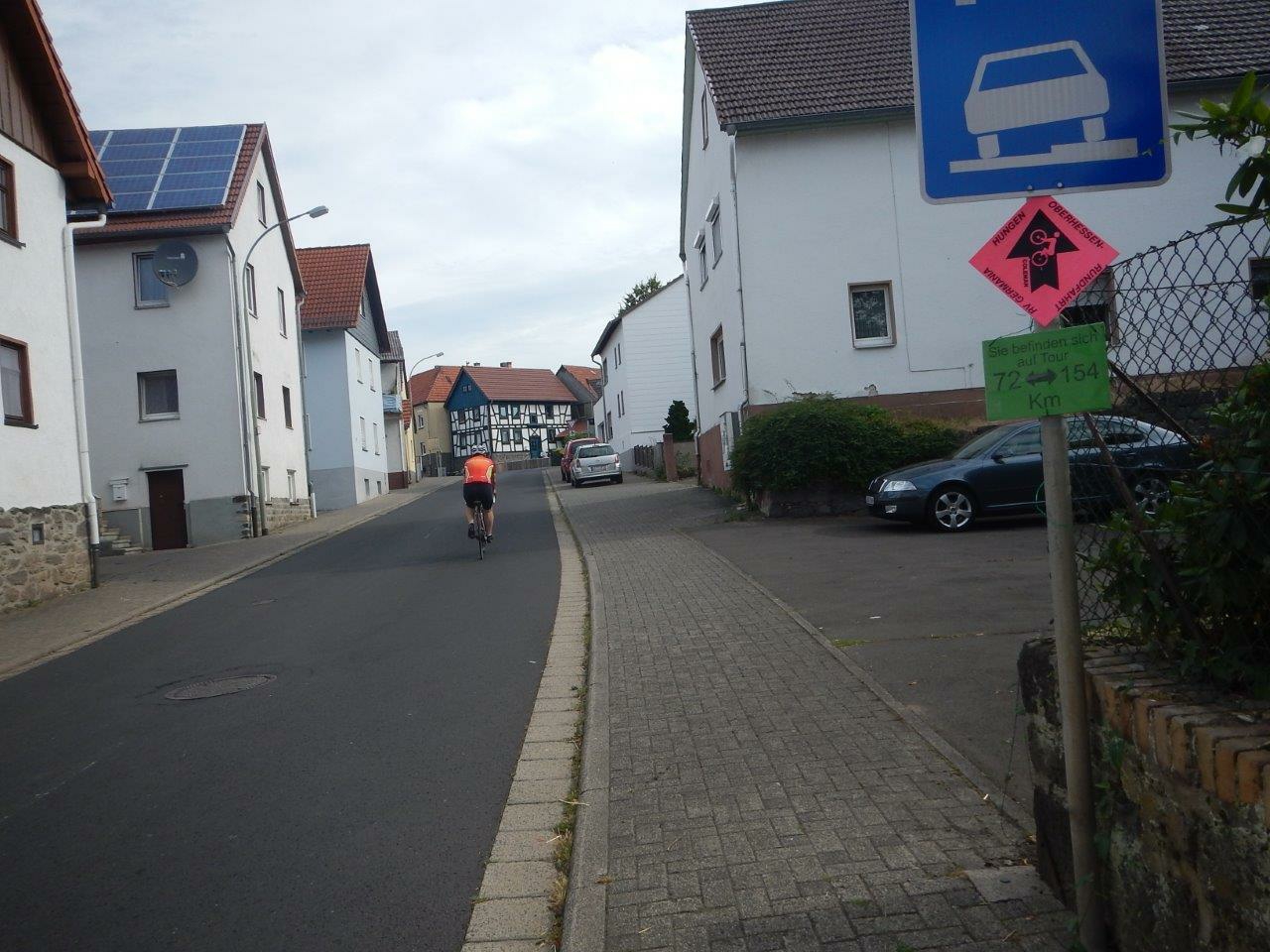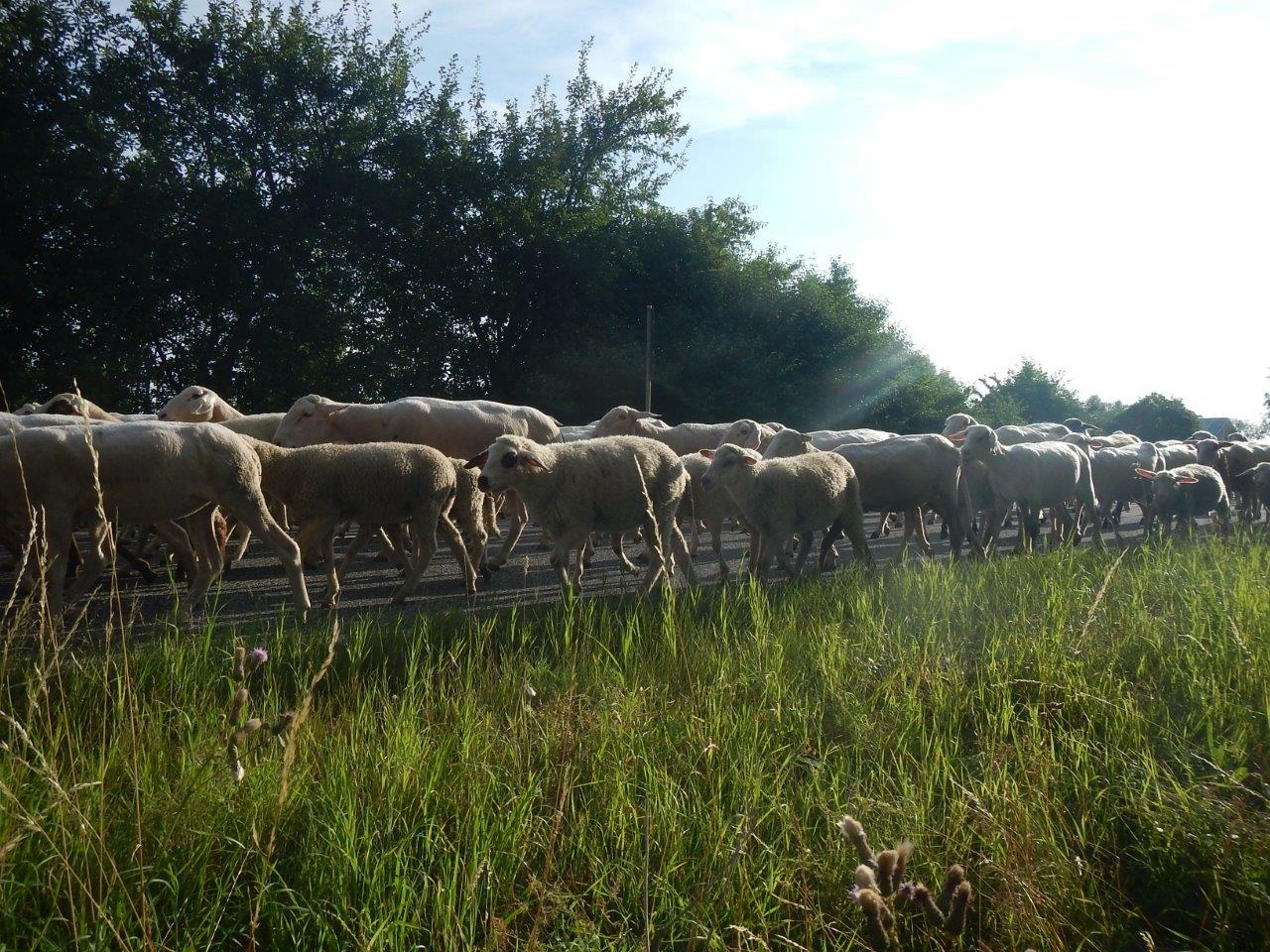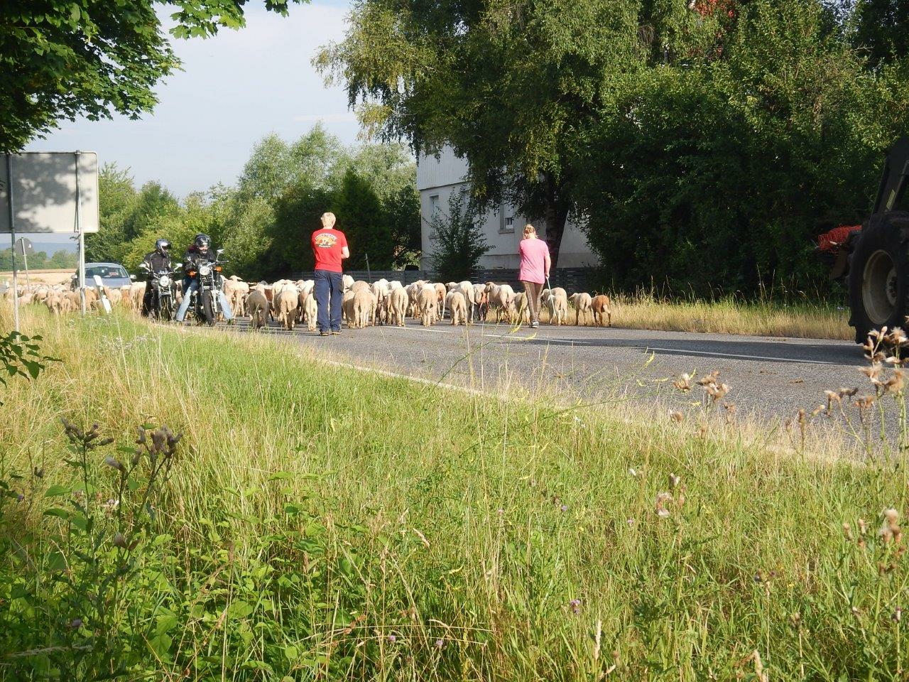 In der Früh empfing uns eine feuchte Kühle, die – Gott sei Dank – noch nicht den Schritt zu einer drückenden Schwüle geschafft hatte. So konnten wir bis zum Vormittag eine große Strecke bei angenehmen Verhältnissen zurücklegen. Wenn die Sonne etwas länger auf uns nieder schien, merkte man deren Kraft und war froh über die vorhandene Bewölkung und den leichten Wind. Die Frühstarter wähnten sich im Vorteil, bis sie im Bingenheimer Ried – die Tourführung wurde wegen einer Dauerbaustelle erforderlich – auf eine Schafherde stießen, die sich von den Radfahrern nicht beirren ließen und gemessenen Schrittes das Bingenheimer Ried von der Aussichtsplattform bis hin nach Reichelsheim durchquerten. Von einem Zeitverlust bis zu 30 Minuten wurde gesprochen, aber auch von dem Schafskot, der zunächst breitflächig auf der Straße lag und dann Rennmaschinen und Radlerwaden zierte. Zudem waren insbesondere mit ultraleichten Laufradsätzen noch Schottersteine zu umkurven, die von zierlichen Schafshufen im Gedränge und Geschiebe der Herde auf den Asphalt gewirbelt wurden. Dies zehrte hier und da an den Nerven und man hörte „hochwertiges Material“ und „CTF-Strecke“ in der ein oder anderen Abwandlung. Doch der weitere Verlauf der Tour beruhigte sicherliche auch diese Gemüter, denn die Touren verliefen weiter auf guten Straßen, auf landschaftlich schönen und verkehrsarmen Strecken. Dass man sich hin und wieder verfuhr, könnte man der Ausschilderung anlasten. Auch wenn diese hier und da verbesserungswürdig war, es fanden sich Pfeile auf der linken Straßenseite und für plötzliche Richtungswechsel wäre eine Verdeutlichung mit Zusatzpfeilen angebracht gewesen, war das Verlassen der Strecke eher der mangelnden Aufmerksamkeit Einzelner zuzuschreiben, die dann auch das Phänomen des „Herdentriebes“ auslösten.