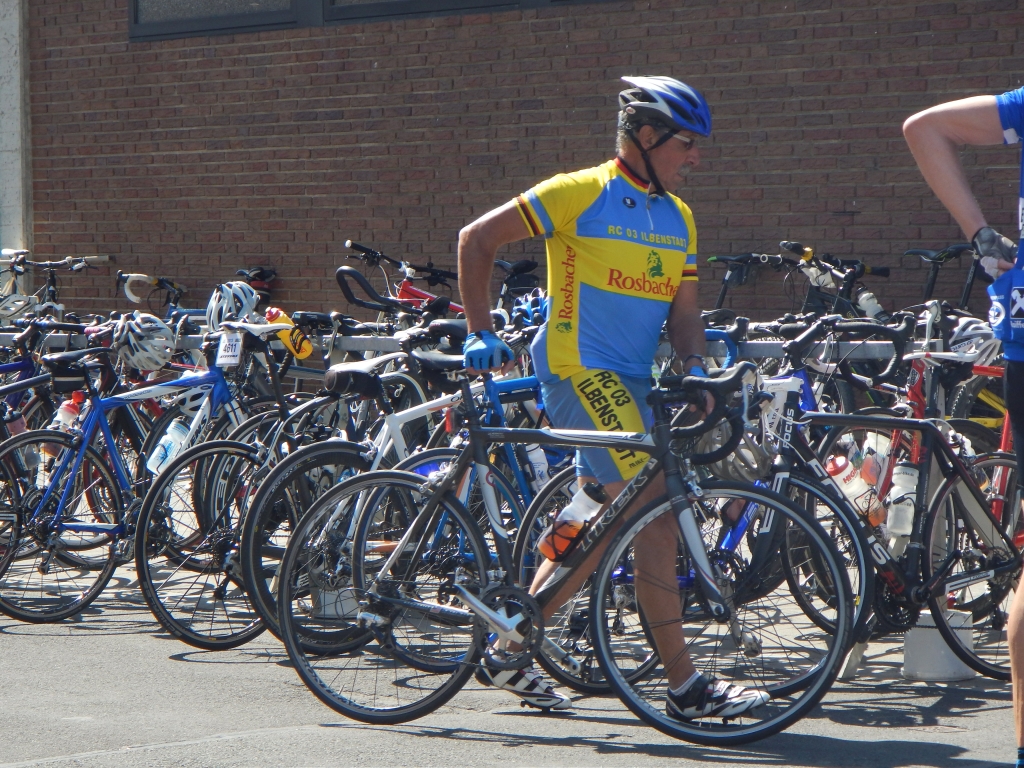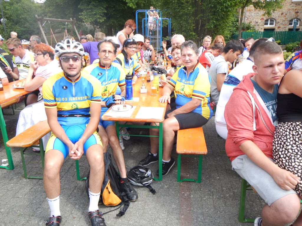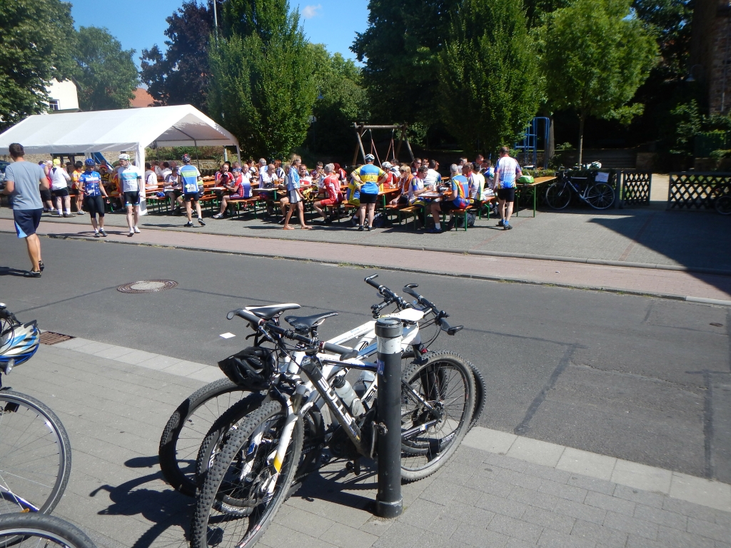 Im Ziel trafen sich dann wieder viele Ilbenstädter Sportlerinnen und Sportler, die mehrheitlich im Sternfahrtmodus angereist waren. In geselliger Runde wurden Neuigkeiten ausgetauscht, Verabredungen getroffen und möglicherweise auch ein bisschen Radlerlatein gesponnen. Farbe ins Spiel oder besser ins Gesicht brachte dann ein Sturz eines Vereinskameraden, der während der Woche ohne Helm auf einer innerörtlichen Fahrt zu Fall kam und dem Gott sei Dank ernsthaften Verletzungen erspart blieben. Die einhellige Befürwortung des Fahrens mit Helm auch außerhalb einer RTF hat denn auch am Ende dieser Nachricht gestanden. Die Physik unterscheidet nicht zwischen alltäglichem und sportlichem Radfahren. Allein die Fallhöhe ist schon für schwere Verletzungen ursächlich, denn ein Erwachsener schlägt mit dem Kopf bei ungebremstem Fall schon mit gut 20 km/h auf dem Pflaster auf!