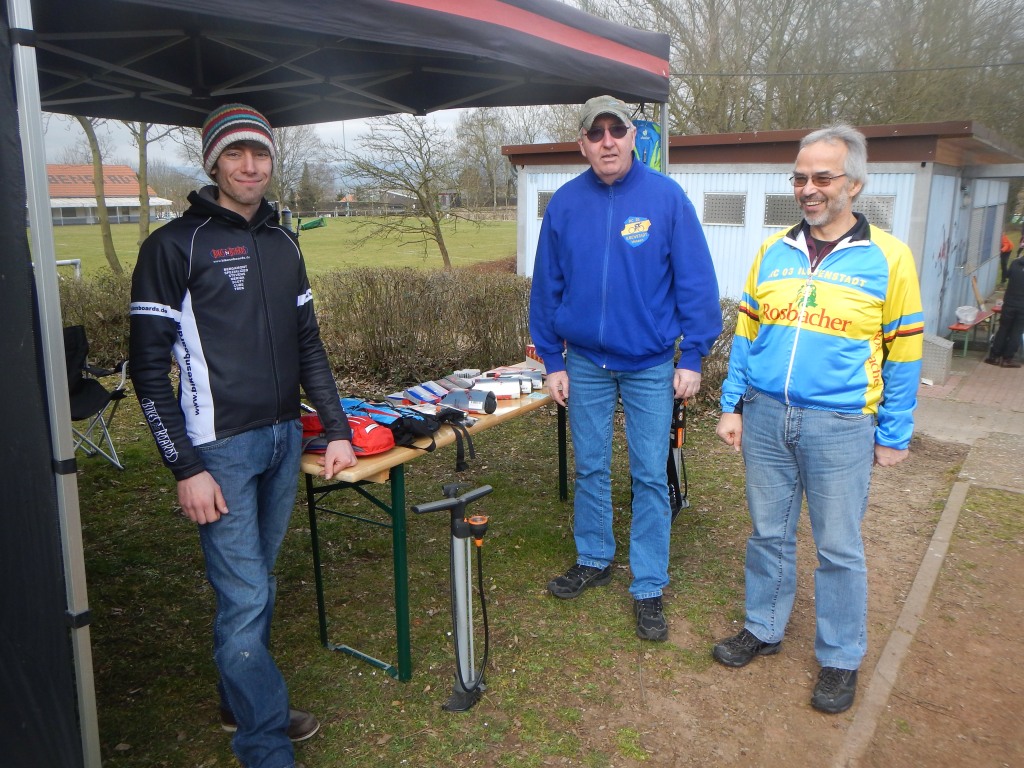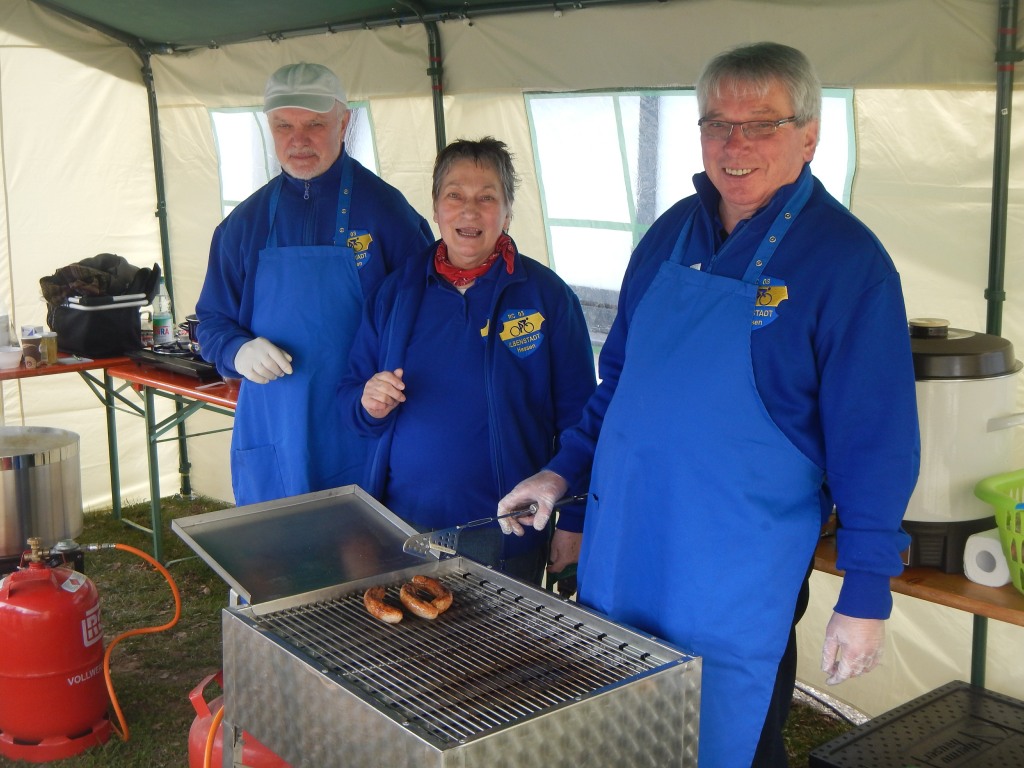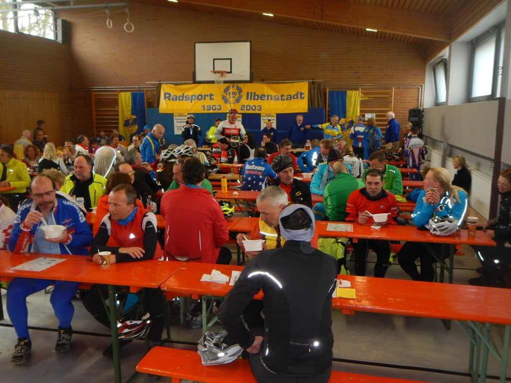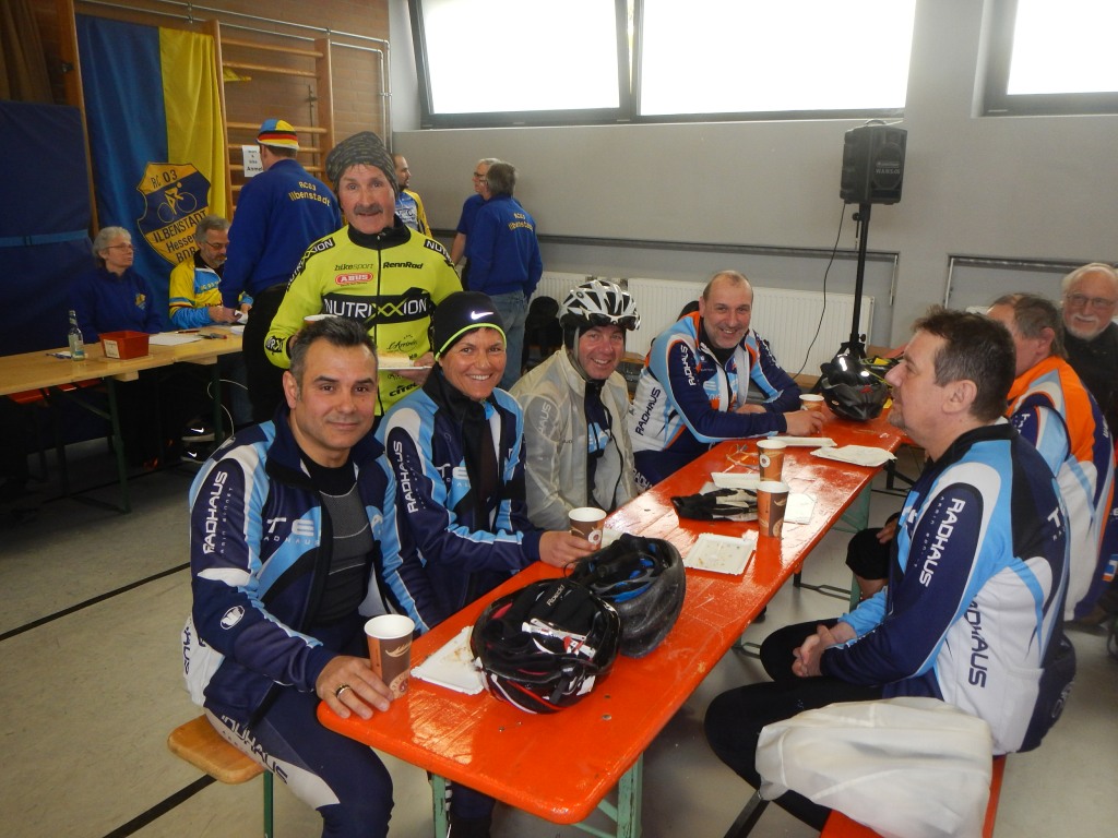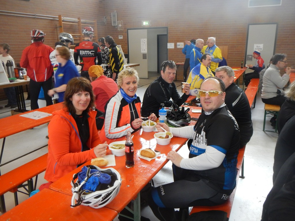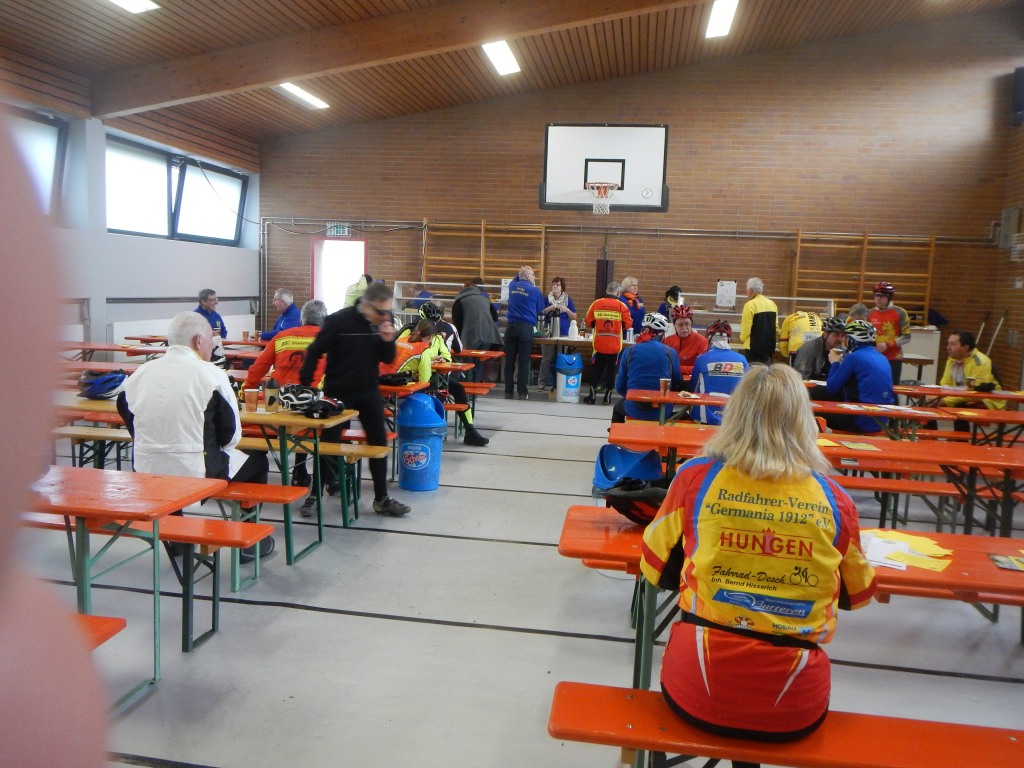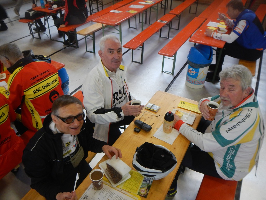 An den Kontrollstellen in Melbach, Münzenberg und Laubach hielten wir neben Bananen und Gebäck auch heißen Tee bereit, um die kühlen Lebensgeister wieder zu wecken. Das muss uns gelungen sein, denn am Ziel herrschte reges Treiben. Man tauschte sich aus und konnte den Tag bei Gegrilltem, Erbensuppe, Getränken und einer gut gefüllten Kuchentheke ausklingen lassen.