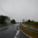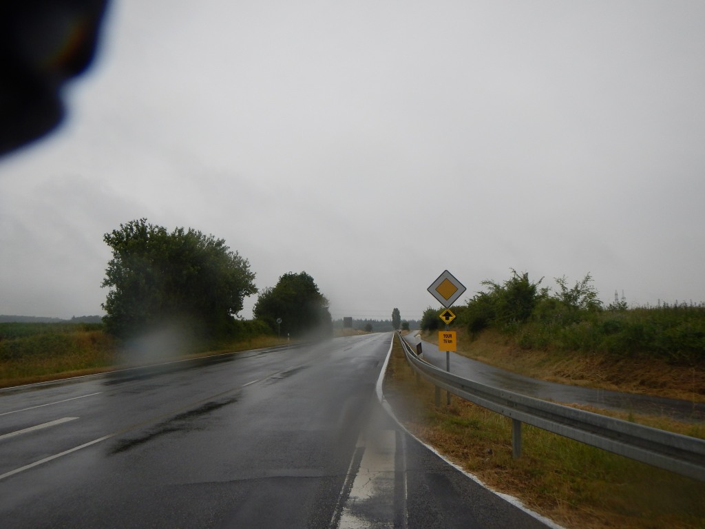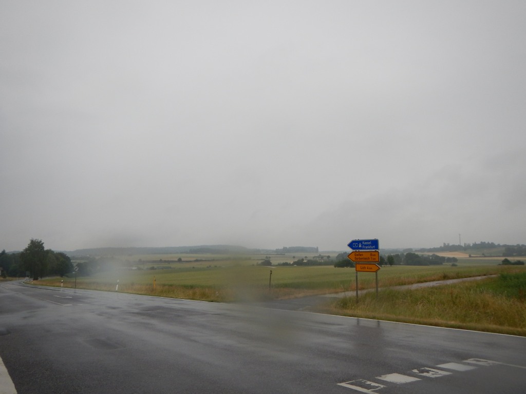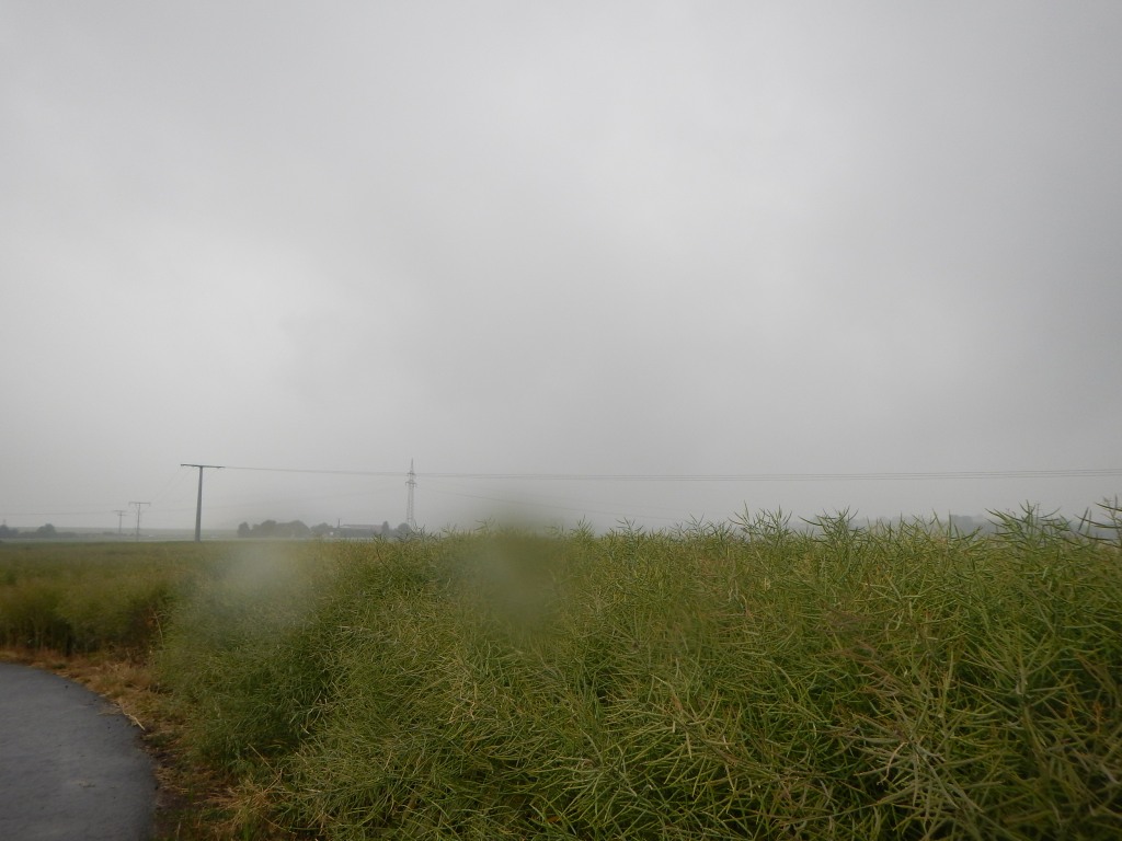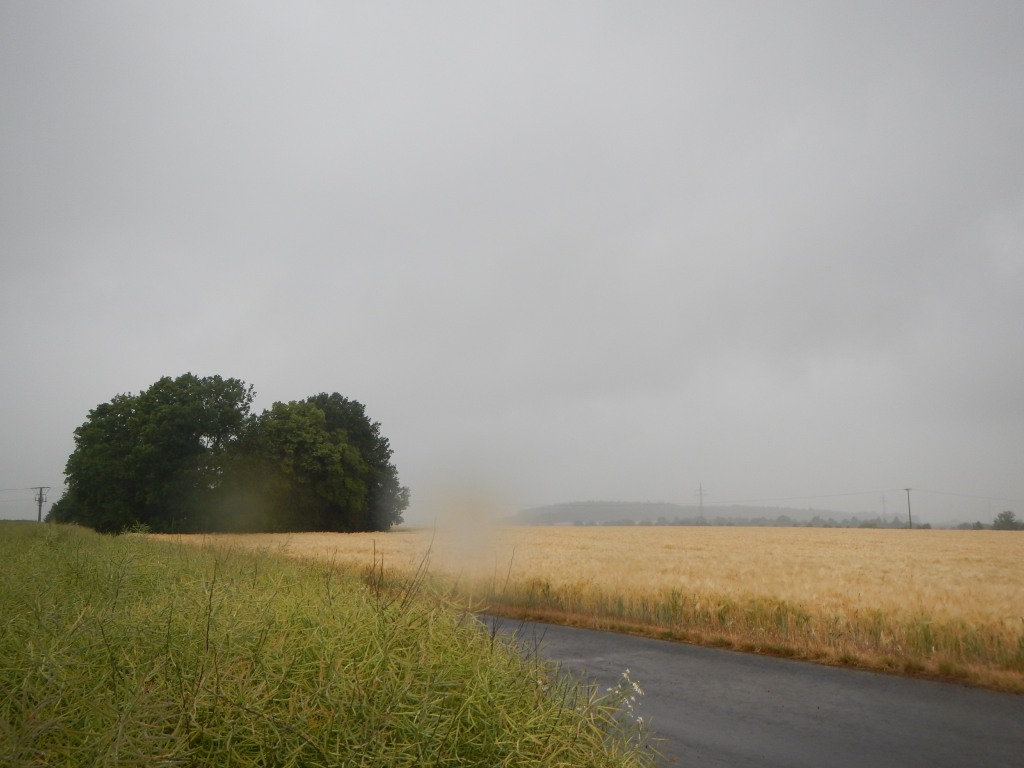 Zurück zur RTF des RV Germania Nieder-Weisel, wo die Fachwartin RTF Silvia Geisler mit ihrem Team gegen die Hattersheimer Konkurrenz, die kühlen Temperaturen und den Regen zu kämpfen hatte. Mit meinem Start setzte der Regen, der zwischenzeitlich etwas nachgelassen hatte, wieder ein und hier ließ mich auch meine Verabredung stehen, beziehungsweise fahren. Die vorherrschenden Farben der Wetterauer Hügel- und Wald- und Ackerlandschaft waren grün, häufig mit einem leichten, teilweise auch sattem Gelbton der reifenden Getreidefelder durchsetzt. Weiter dominierte der schwarze Asphalt der Straße und das einheitliche Grau der Wolken, die auch keinen Sonnenstrahl zuließen. Doch auch diese Farbkomposition hatte ihre Reize und nach der langen Trockenperiode, präsentierte sich den unerschrockenen Pedaleuren eine neue Facette der heimischen Region. 120 Starterinnen und Starter verirrten sich nach Nieder-Weisel und so verwunderte es nicht, wenn man allein bei gleichmäßigem Landregen die Landschaft in sich aufnehmen und den Gedanken freien Lauf lassen konnte.