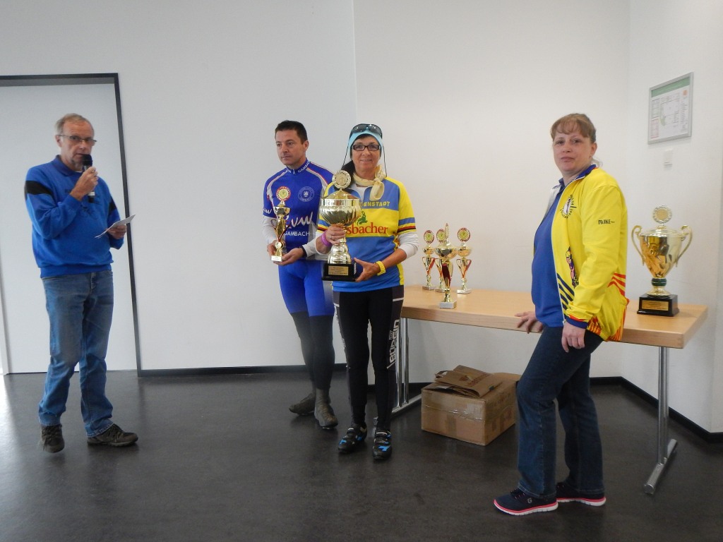 Im Ziel war bei Kaffee, Kuchen, Gegrilltem und kühlen Getränken das Wetter weiter Thema, der Aspekt lag bei den meisten – von den Sternfahrern abgesehen – auf „Geschafft!“ Im Wettbewerb der BDR-Vereine hatten wir die Nase mit 17 gestarteten Teilnehmern von 20 vorgemeldeten knapp vor dem RV Wanderlust Gambach, der 16 Radlerinnen und Radler von 33 (!) gemeldeten auf die Strecke brachte und dem RV Germania Hungen von deren 20 vorgemeldeten 4 nicht wetterfest waren. Die weiteren Plätze belegten RV Klein-Linden (8/13 TN), RV Ober-Mörlen (7/10 TN), RSG Grünberg (6/7 TN), RSV Oppershofen (5/10 TN), RV Anspach (3/4 TN) und letztlich noch die Sandhasen aus Wölfersheim (2/6 TN). So bleibt der Wanderpokal wieder mal ein Jahr in Ilbenstadt.