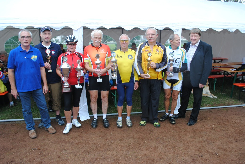 Zur Siegerehrung richtete Herr Bürgermeister Dr. Hertel ein Grußwort an die Radlerinnen und Radler und überreichte den Siegerpokal und den Wanderpokal der Stadt Niddatal an den RV Germania Nieder-Weisel, der mit 13 Teilnehmern das Feld vor RV Ober-Mörlen, RV Germania Hungen, Radteam Neu-Isenburg sowie RSC Offenbach-Bürgel anführten.