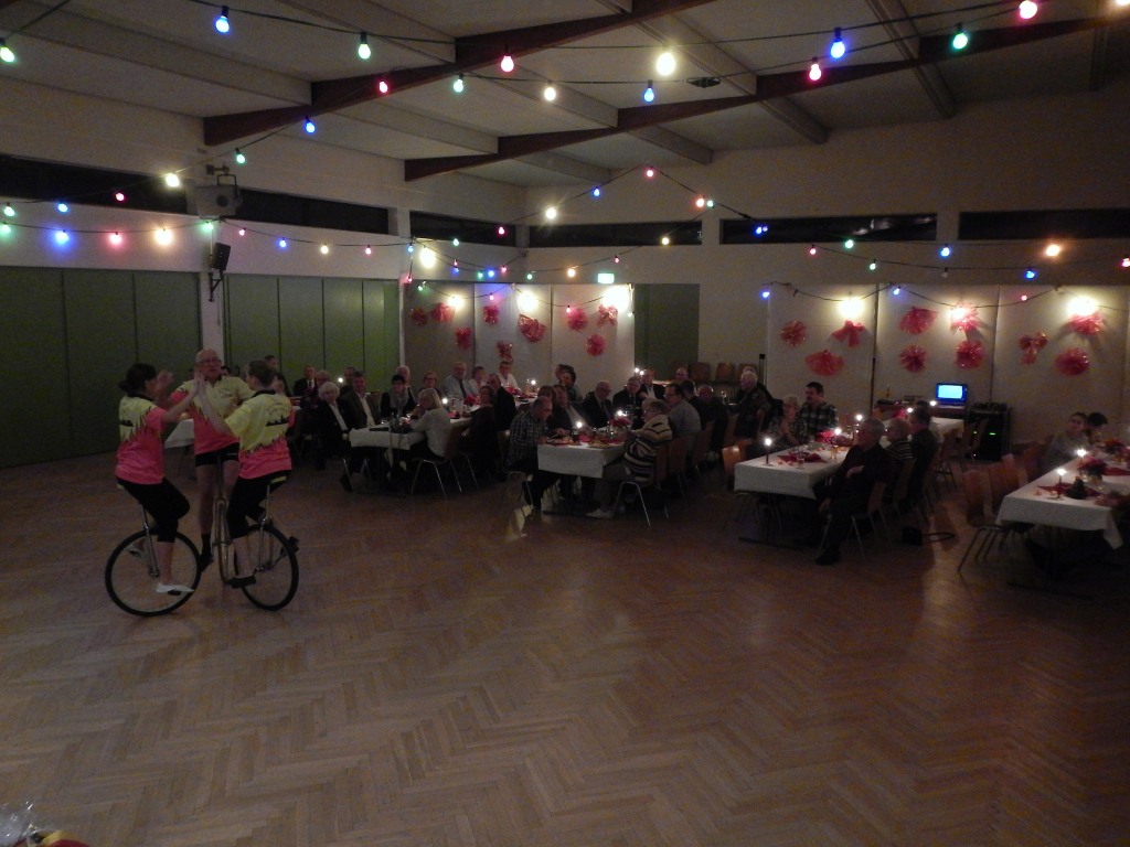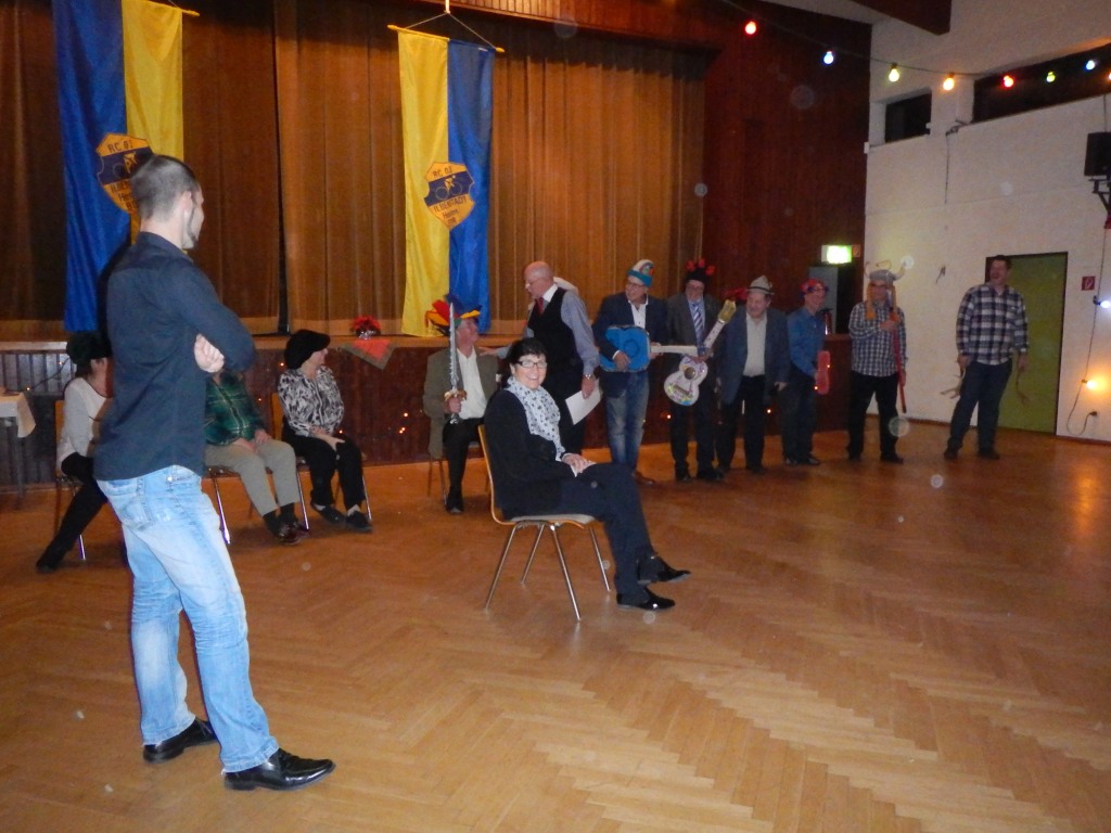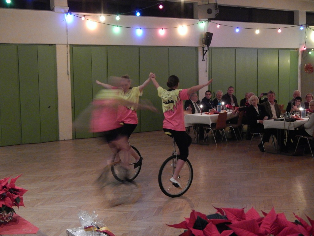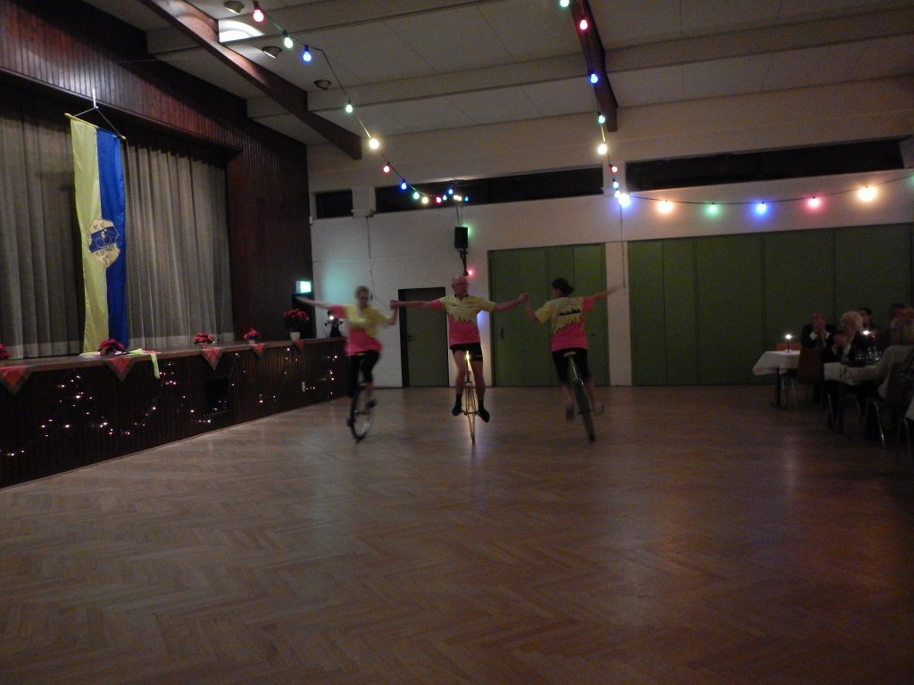 Helmut Rühl, Urgestein der Kunstradfahrer beim RV Germania Rockenberg und Unterhaltungstalent, trug wieder mit Anekdoten, kleinen Geschichten, Späßen und Rollenspielen zur Unterhaltung bei. Früh am Abend schwang er sich auf sein Einrad und zeigte mit Carlotta Wiesner und Pia Burkhard der versammelten Zweiradfahrerelite des RC 03 Ilbenstadt und der Bundesehrengilde, wie man sich anmutig, elegant und synchron mit seinen Mitstreiterinnen auf Einrädern bewegen kann. Der Applaus des Publikums war dem Trio sicher.