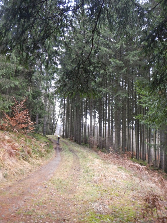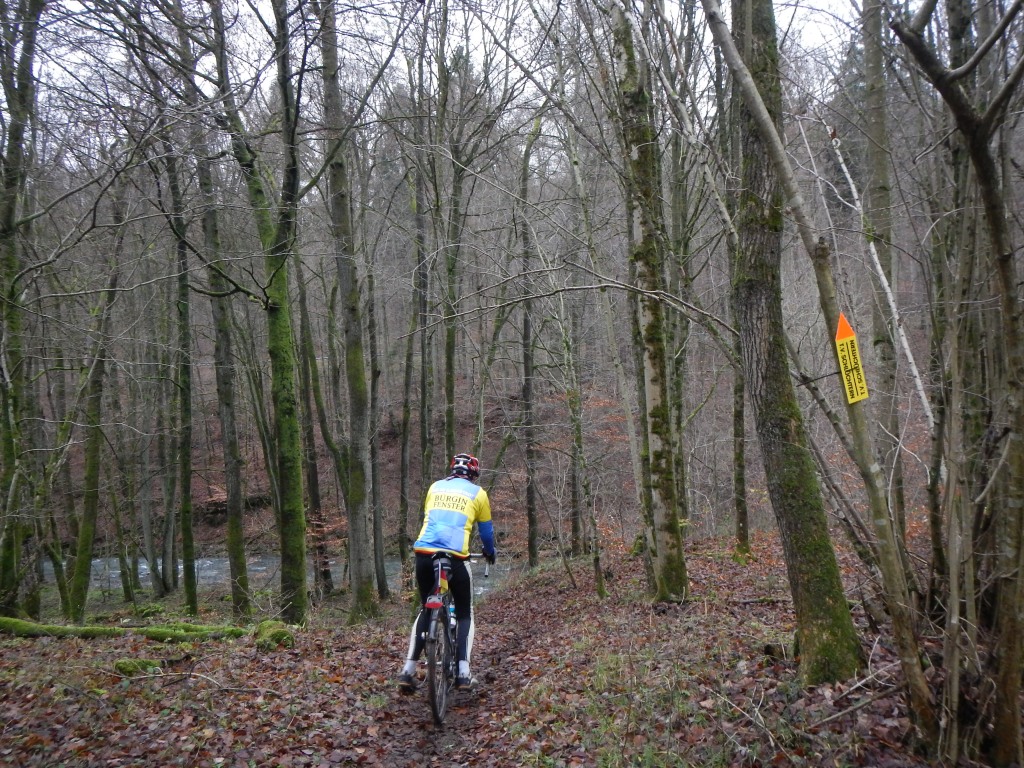 Der regenreiche November, die milden Temperaturen – naja, der Start erfolgte bei 7° Celsius – versprachen wieder an einigen Stellen aufgeweichtes Terrain. Dazu gehört natürlich das Umfeld der Brücke über den Steinaubach, deren Holzplanken mit dem Wasser-Erde-Gemisch Glatteis sehr nahe kommt, und die Passage am Steinaubach bis zur Überquerung der L 3178, die doch den ein oder anderen aus dem Sattel gezwungen hat. Ein lockeres Auf und Ab, im Wechsel auf Feld- und Waldwegen, dazu interessante Singletrailpassagen, aber auch asphaltierte Strecken, die sich nicht sinnvoll umgehen ließen, gestalteten die Tour abwechslungsreich. Die hügelige Landschaft forderte Krafteinsatz und Ausdauer heraus. Bouillon und Schmalzbrote rüsteten uns für die nächsten Kilometer, die auf freien Flächen in der Höhe mit einem frischen Gegenwind aufwarteten. Nach der Kontrolle in Ahl, die im ausgefallenen Ambiente einer Fahrradwerkstatt ihren Service an Frau und Mann brachte, wechselten wir zur letzten Etappe in den Spessart. Durch den Wald waren einige Höhenmeter zu überwinden, danach ging es über Seidenroth hinunter nach Steinau an der Straße; über 40 Kilometer und 640 Höhenmeter lagen hinter uns.