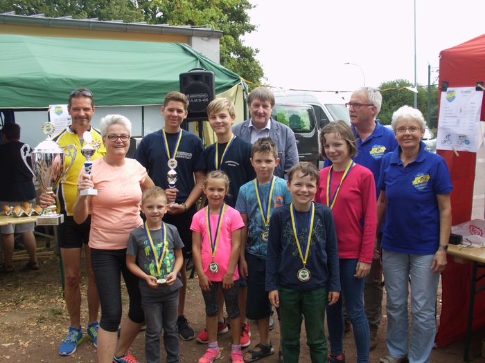 Bild 3: Die geehrten Teilnehmer der BDR-Vereine: Jörg Jakob für den RTC Sandhasen Wölfersheim (h.r) und Ursula Endres für das Radteam Neu-Isenburg (2. v.r.), RC Hattersheim fehlt.