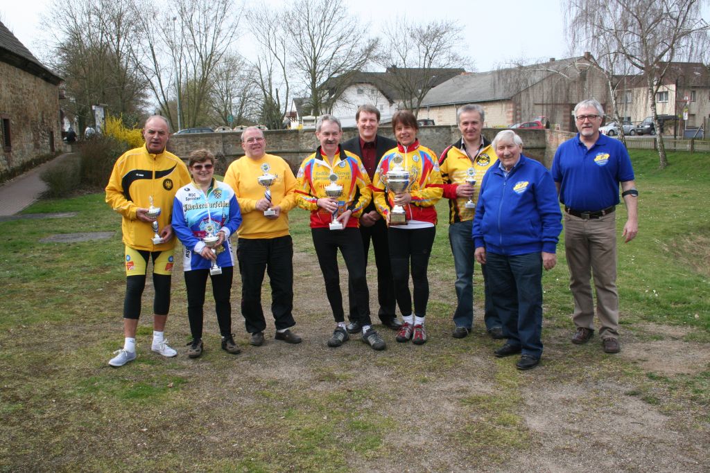 Nachdem sich der Zielbereich gefüllt hatte und reges Treiben in und vor der Halle herrschte, stand die Siegerehrung an. Herr Dr. Hertel, der Bürgermeister von Niddatal, richtete ein Grußwort an Gäste und Gastgeber und drückte seine Freude aus, dass bei gutem Wetter Ilbenstadt wieder Ziel von vielen Radsportlerinnen und Radsportlern aus der näheren und weiteren Umgebung geworden ist. Er wirkte neben unserem Ehrenvorsitzenden Theo Hof an der Siegerehrung mit und konnte die Glückwünsche den Geehrten übermitteln. Es wurden folgende Platzierungen erreicht: